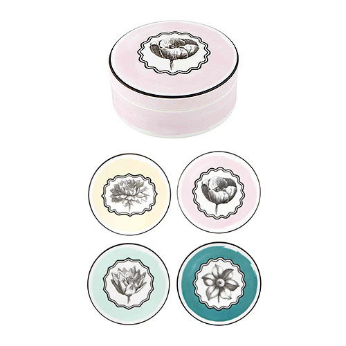 Ensemble de 4 sous-verres ronds et boîte fait de porcelaine. Avec ses lignes douces la Collection Herbariae s’illustre de gravures de fleurs choisies pour leur beauté délicate et la force de leur évocation