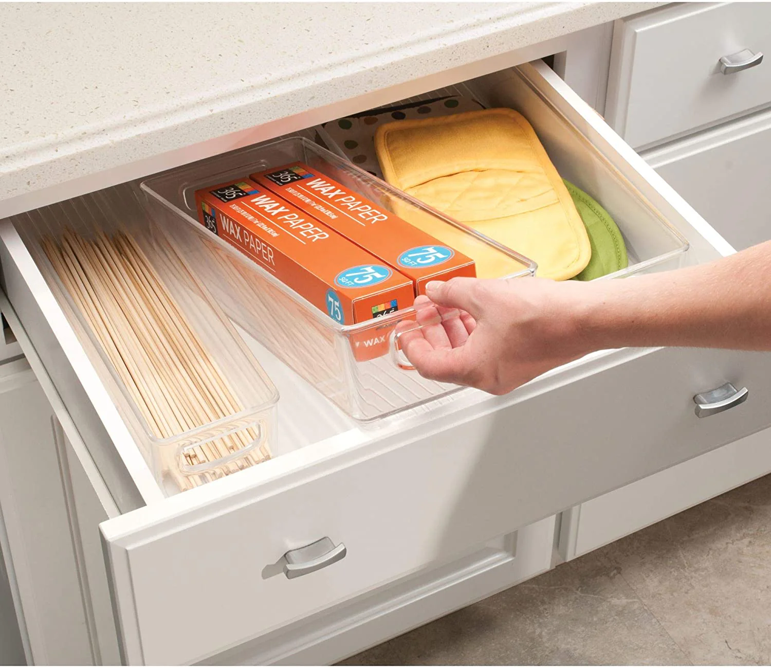 Crée une organisation instantanée dans le garde-manger ou les tiroirs pour des articles tels que du papier d’aluminium et des boîtes d’emballage en plastique, des sacs à collation, des ustensiles, des épices, des sachets, etc.