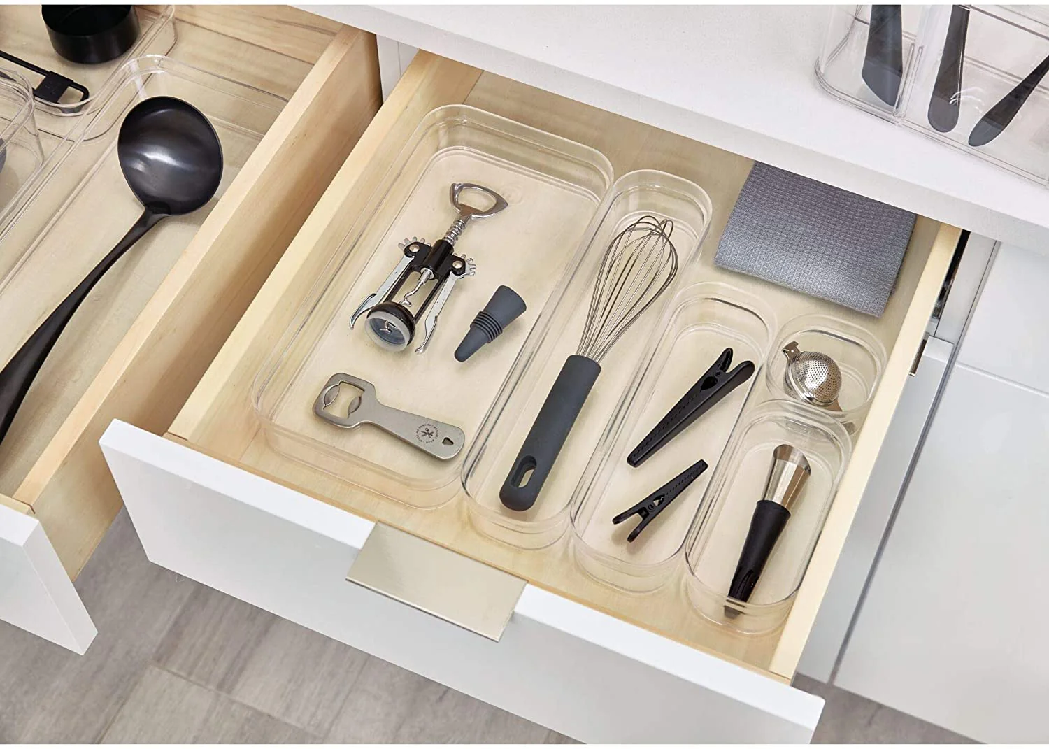 - Organiseur de tiroir de cuisine : offre un rangement et une organisation pour les petits ustensiles, gadgets, tasses et cuillères à mesurer, clips de sac, bouchons de vin, ouvre-bouteilles, etc. dans les tiroirs de cuisine et de garde-manger