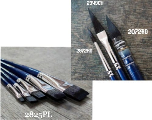 Le lavis rond bout pointu (série 2072RO) , le rond bout pointu (2972RO), le plat forme « bulbe (2349CH) et enfin la brosse plate (2825PL) et le long effilé (2972FP)