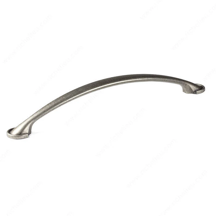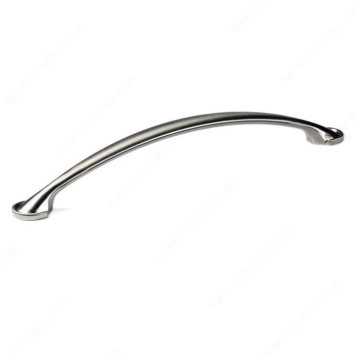 Poignée contemporaine en métal, arquée et aux extrémités arrondies de Richelieu. Rehausse élégamment les portes de réfrigérateurs ou de garde-manger, les larges tiroirs ou les portes hautes!