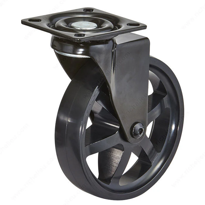 Roulette en aluminium noir sur noir qui ajoute une apparence vintage à vos meubles avec les fonctionnalités modernes d’une roulette. Disponible en deux hauteurs, avec ou sans frein.