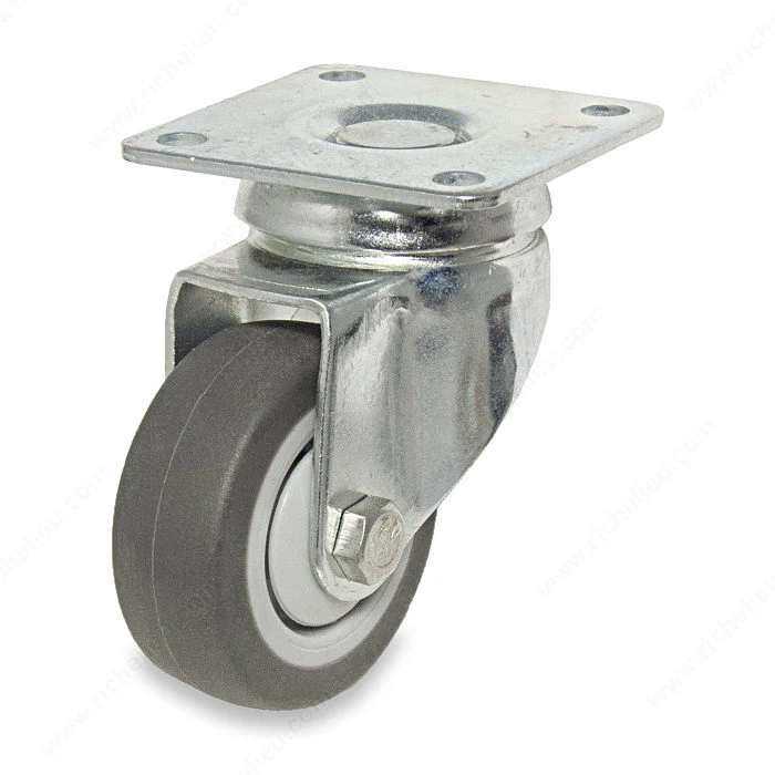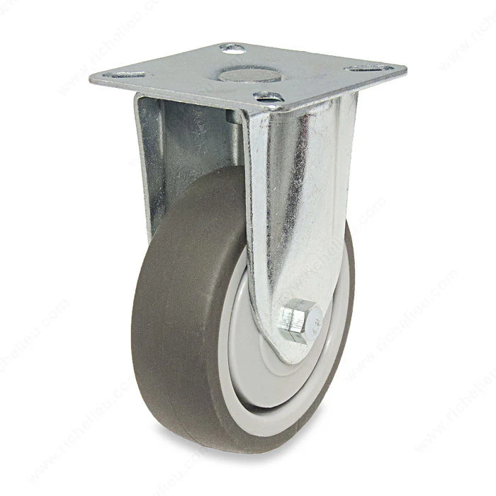 Roulettes en caoutchouc thermoplastique gris d’une capacité de charge intermédiaire avec plaque. Elles sont pivotantes et possèdent un mécanisme de freinage complet.